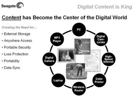 «Использование продукции под брендом Seagate буквально означает возможность вынести свою цифровую жизнь за пределы настольного компьютера или ноутбука, при этом цифровое содержимое может быть доступно там и тогда, когда оно необходимо» – говорит старший вице-президент Seagate Джим Дракри. [4]
