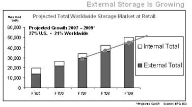 Мировые поставки накопителей на жестких дисках в 2006 году увеличились на 15,5% с 375,8 миллионов до 434,2 миллионов штук. Основной рост произошел за счет резкого увеличения спроса на внешние накопители, побуждаемого желанием пользователей иметь резервное устройство большого объема для хранения аудио и видеофайлов. В результате в 2006 году рынок внешних накопителей больших объемов испытал настоящий бум: было продано на 37% больше внешних жестких дисков, чем в 2005 году. [1]