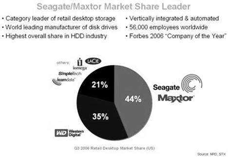 Если судить по данным NPD и Seagate, то объединенной компании Seagate+Maxtor в третьем квартале 2006 года принадлежало 44% retail-рынка. Чуть больше трети покрывалось WD, остальное составляли такие компании как Iomega, LaCie, SimpleTech и многие другие, специализирующиеся на внешних накопителях. Позиции у Seagate здесь, таким образом, хорошие, и было бы неправильно этим не воспользоваться и не предложить рынку новые продукты, которые могут укрепить эти позиции.