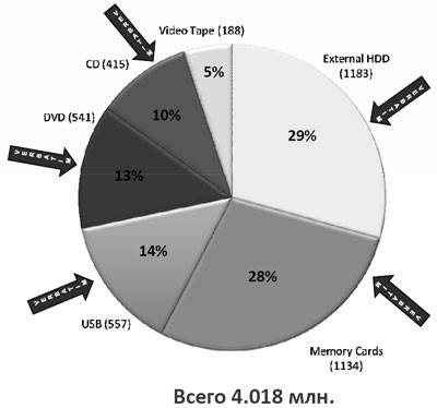 Но не стоит думать, что проблемы способны вызвать только уникальные материалы — и «обычный» медиаконтнет ныне зачастую вызывает необходимость решать вопросы с хранением. Просто потому, что продажи через сеть все более активно теснят традиционную дистрибуцию. Если раньше мы приобретали фильм на кассете или видеодиске, то теперь все чаще просто скачиваем его из сети. Объемы рабочей информации ныне не идут ни в какое сравнение с мультимедийным контентом, однако и благословенные 90-е годы тоже в этом плане остались далеко позади. Тем более что медиатехнологии и в бизнес вторгаются, так что хорошая презентация ныне это не набор слайдов как когда-то, а мегабайты информации, включая звук и видео. [6]