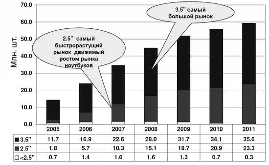 Кроме того, данный сегмент рынка очень быстро растет, что хорошо видно по приведенной диаграмме (следующая страница). Для ориентира — в 2005 году продажи жестких дисков (вообще; в целом) составили 375.8 миллиона штук, а в 2006 — 434.2 миллиона штук. На ВЖД же пришлось 14.2 миллиона (3.8%) и 24 миллиона (5.5%), т.е. рынок ВЖД рос более быстрыми темпами, нежели продажи винчестеров вообще.