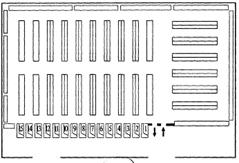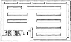 "Решетка" с линейным продольным размещением оборудования, т.е. стеллажи с товарами преимущественно располагаются перпендикулярно входящему в зал покупательскому потоку.