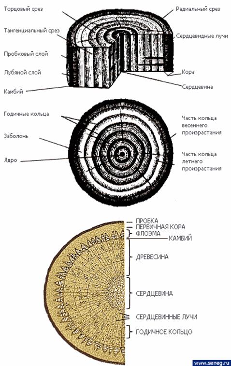 На поперечном разрезе ствола древесного растения можно выделить следующие основные макроструктурные единицы древесины:
