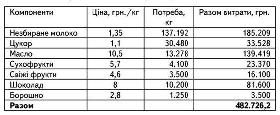 Відповідно, витрати на вторинну упаковку: 1,08 грн. х 960.854 ящ.=1.037.722,3 грн. Сума витрат на основну сировину і упаковку, з урахуванням 10% на непередбачені витрати: 10.136.418,3 грн. х 1,1 = 11.150.060,1 грн.