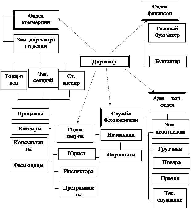 На современных предприятиях наиболее распространена иерархическая структура управления. И универсам «Мечта» не является исключением, так как там есть руководители, специалисты и исполнители, то есть подчинение нижестоящего уровня вышестоящему.
