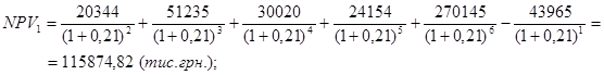 Грошовий потік за роками наведений в таблиці 8.1. Ставка дисконтування ― 21%.
