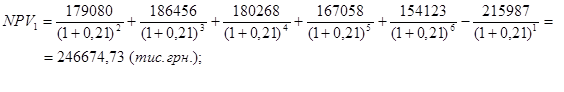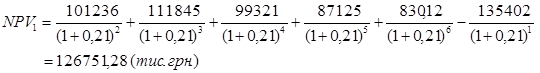 | Оптимістичний | 0,3 | -215987 | 179080 | 186456 | 180268 | 167058 | 154123 |