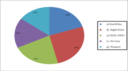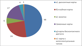 Лидером среди изучаемых типографий является Right print. (26%). Меньший спрос на услуги Кard4you (20%) ПКТ (22%), AV-rora (17%) вызван тем, что Right print предлагает наибольший ассортимент продукции и сопутствующих услуг. Самый высокий спрос наблюдается на дисконтные карты . Именно такие тиражи размещали 48% респондентов. Меньший спрос на карты с интеллектуальным чипом и карты бесконтактного доступа.