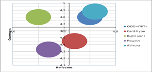 Right print занимает самое удачное место на графике. Показатели фирмы занимают левый верхний квадрант, что соответствует низкой стоимости при высоком качестве продукции. Явными конкурентами являются ООО «ПКТ» и AV-rora. Другие два конкурента находятся на значительном расстоянии от них, и не вступают в жесткую конкуренцию, специализируясь на своих сегментах.