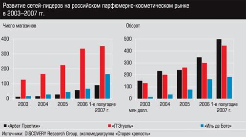 В настоящий момент российский рынок косметической продукции характеризуется переходом к цивилизованным формам торговли, когда на долю открытых рынков остается не более 16% объема продаж. Динамично развиваются специализированные парфюмерно-косметические розничные сети, прирост которых достигает 30-40% в год. По имеющимся данным, в России около 60% специализированной розницы контролируют несколько основных игроков: «Арбат Престиж», «Л'Этуаль», Rive Goche(принадлежит петербургской компании «Парфюм-Стандарт»), Иль де Ботэ и некоторые другие московские сетевые магазины.