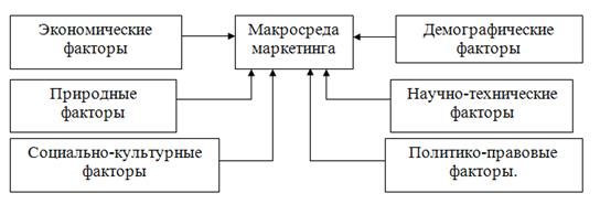 Факторы макросреды, влияя на всю совокупность хозяйствующих на данном рынке субъектов, определяют основные принципы и условия деятельности фирмы, поэтому они должны учитываться в первую очередь, так как негативные последствия здесь могут быть наиболее серьезными. Макросреда определяется факторами: