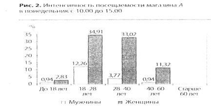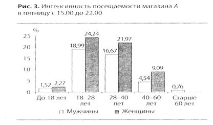 На первый взгляд график не самый информативный, и предположить, какой окажется целевая аудитория (половозрастной состав), можно было бы, не проводя сложных расчетов. Однако когда сравниваешь подобные отчеты каждого розничного магазина по отдельности, исследуя данные за определенные дни недели и даже часы, для анализа появляется интересный блок информации. В качестве примера рассмотрим графики, отражающие интенсивность посещаемости магазина А в понедельник с 10.00 до 15.00 (рис. 2) и в пятницу с 15.00 до 22.00 (рис.3).