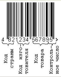 Рис. 4 Структура штрихового кода EAN Первые 2-3 цифры - префикс национальной организации; - следующие цифры - это регистрационный номер предприятия внутри национальной организации; - следующая группа цифр - это порядковый номер продукции внутри предприятия; последняя 13-я цифра - контрольное число. Оно вычисляется из предыдущих двенадцати. Контрольное число вычисляется по определенному алгоритму. Оно отражает последовательность всех значений знаков кода.Ошибочным является мнение о том, что по штриховому коду можно определить страну-производителя. Штриховой код несёт информацию только о том, в какой национальной организации зарегистрировано предприятие.Штриховой код EAN используется для уникальной идентификации продукции.Штриховой код на товаре в магазине является эквивалентом как цены, так и наименования покупки. Если два товара отличаются по цене, то они должны иметь различные штриховые коды (номера EAN).Наибольший опыт использования штриховых кодов за рубежом и в определенной мере в России накоплен в производстве и торговле товарами народного потребления, где наибольшее применение имеет код EAN, в ассоциацию которого входят уже более 30 стран, включая Россию.Заключение