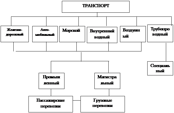Транспорт в зави симости от масштаба его использования подразделяется на две са мостоятельные группы - магистральный и промышленный. Маги стральный транспорт (транспорт общего пользования) применя ется на путях сообщения, связывающих крупные города, промыш ленные центры и экономические районы.[4] На рис. 1 представлена классификация видов транспорта:[5]