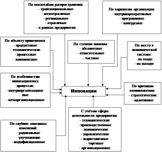 В настоящее время эффективность инновационной деятельности предприятия определяется, прежде всего, наличием отлаженной системы инвестирования, кредитования, налогообложения, функционирующих применительно к инновационной сфере научных разработок. Следует различать понятия «новшество» и «инновация» [7, c.271]. Новшество – оформленный результат фундаментальных, прикладных исследований, разработок или экспериментальных работ в какой-либо сфере деятельности с целью повышения её эффективности. Новшества могут оформляться в виде: открытий; изобретений; патентов; товарных знаков; рационализаторских предложений; документации на новый или усовершенствованный продукт, технологию, организационную, производственную или другую структуру и т. п. Инновации – это новшества, доведённые до стадии коммерческого использования и предложения на рынке с целью получения определённого положительного эффекта. Всё многообразие инноваций можно классифицировать по ряду признаков [4, c. 410]. (рис. 1.1.).