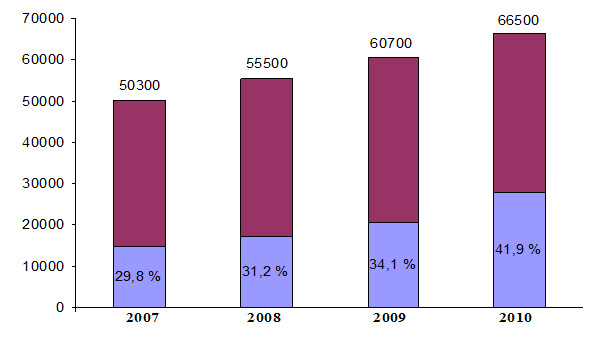 Рис. 3.1. Удельный вес энергонасыщенных тракторов в общем объёме экспорта тракторов в 2007-2010 гг.