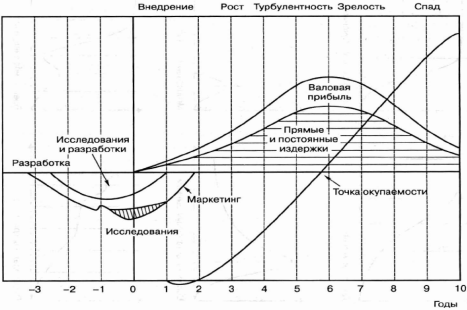 Финансовые потоки предприятия распределены по стадиям ЖЦТ очень неравномерно. Прибыль предприятия может быть отрицательной в течение длительного периода времени, в особенности на рынках с долгими стадиями внедрения. Инновационная фирма начинает получать прибыль только на стадии турбулентности, а иногда и на стадии зрелости. Только к этому времени она возмещает свои предыдущие убытки и достигает высокой валовой прибыли и низких издержек (последние обусловлены эффектами масштаба и опыта).