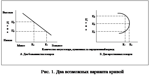 Кривая показывает, какое количество товара будет продано на рынке в течение конкретного отрезка времени по разным ценам, которые могут взиматься в рамках данного отрезка времени. В обычной ситуации спрос и цена находятся в обратно пропорциональной зависимости, т.е. чем выше цена, тем ниже спрос. И соответственно, чем ниже цена, тем выше спрос. Так что, подняв цену с Ц1 до Ц2, фирма продаст меньшее количество товара. Вероятно, потребители с ограниченным бюджетом, столкнувшись с выбором альтернативных товаров, станут покупать меньше тех, цены которых оказываются для них слишком высокими.