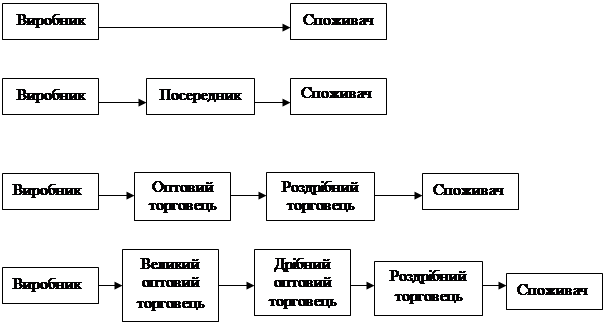 Рівень каналу розподілу – це будь-який посередник, що виконує певну роботу з просування товару і передачі права власності на нього кінцевому споживачеві. Оскільки певні функції розподілу виконують і сам виробник, і кінцевий споживач, вони також входять до складу будь-якого каналу. В цілому протяжність каналу залежить від кількості проміжних рівнів у ньому (рис. 1.2.).