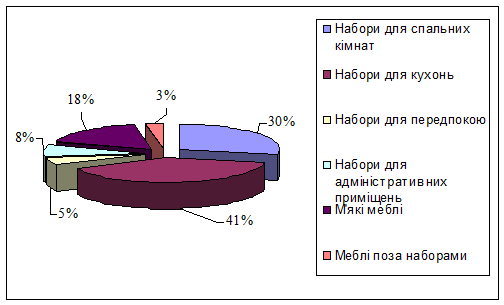 У 2008 р. вся реалізація – 100 % відбулась на вітчизняному ринку, із них 60% реалізованих меблів було призначено для групи споживачів із середнім достатком, 25 % –– для споживачів із низькими доходами (меблі поза набором виготовлені із ДСП, облицьованого синтетичним шпоном, комплектовані простою фурнітурою) і лише 15 % було реалізовано за високими цінами –– це рівень дорогих та елітних меблів.