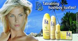 Печатная реклама данной компании стоит на одной ступени с компанией “Wella”, её можно встретить в глянцевых журналах, привлекает внимания потребителей. Как правило, реклама выполнена в ярких цветовых решениях с оригинальным замыслом. На данной рекламе видно тропическую местность, которая манит нас ароматами “Fa”. Но выражение лица девушки не соответствует рекламе, складывается ощущение, что она из другой рекламы.