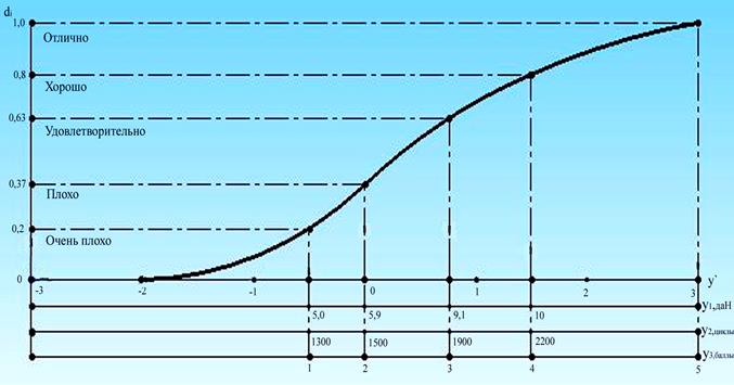 Функция желательности отражает зависимость оценок, или показателей желательности (d), от безразмерных показателей (у), в которые переводят размерные (натуральные) показатели качества. Эта зависимость выражается уравнением: