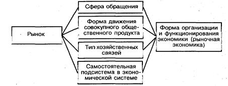Таким образом, можно выделить еще одно понимание рынка – как общественной формы организации и функционирования экономики, при которой обеспечивается взаимодействие производства и потребления без посреднических институтов, регулирующих деятельность, производителей и потребителей, прямое и обратное воздействие на производство и потребление.В. В. Герасименко пишет, что обмен товаров через рынок становится формой системы экономических отношений рыночной экономики и организация системы обмена товаров, ее институты, процесс этого обмена, его субъекты, сами товары, которые функционируют в рамках этой системы – все это приобретает имя рынка. Иногда рынок определяют как сферу купли-продажи товаров и услуг. Но сфера рынка не ограничивается только этими отношениями.