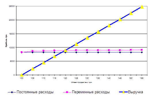 Точка безубыточности предприятия находится на уровне объема продаж 120000 грн./мес., что изображено на рисунке.