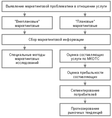 Маркетинговое исследование услуги или ее рыночного окружения представляет собой систематические мероприятия по получению оперативной информации в отношении данных, описывающих текущее или перспективное (прогнозное) состояние самой услуги или ее маркетингового окружения, а также анализ и отражение данных в форме, необходимой для решения стратегических и тактических задач, стоящих перед фирмой. Проведенные в плановом порядке маркетинговые исследования дают возможность получать конкурентные преимущества, снижать финансовые и коммерческие риски предпринимательской деятельности, определять отношение покупателей к оказываемой услуге, давать оценку стратегической и тактической деятельности фирмы, повышать эффективность коммуникационных рыночных мероприятий, определять оптимальные сегменты позиционирования услуг, определять характер жизненного цикла услуг.