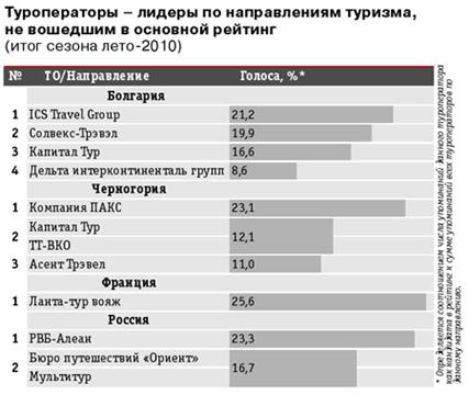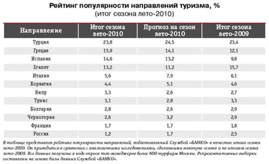 Рисунок 1. Рейтинг популярности направлений туризма, итог сезона 2010