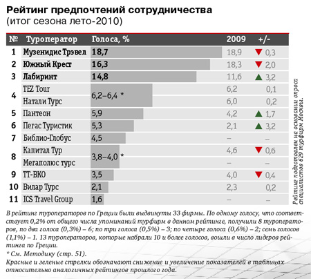 Пятерка лидеров рейтинга предпочтений сотрудничества по Греции осталась неизменной. Возглавляет ее «Музенидис Трэвел» с 18,7% голосов столичных агентств. Некоторые эксперты считают лидерство этой компании спорным, указывая, что по объемам впереди должен стоять «Южный Крест» (16,3%). Но если учесть, что рейтинг отражает симпатии агентств, то объяснение лежит на поверхности. «Музенидис Трэвел» этим летом предпринял атаку на Крит. И так как на этом острове, как обычно, из-за жесточайшей конкуренции проснулся вулкан спецпредложений, туроператор одновременно пытался предотвратить отток клиентов от своего ключевого направления – Северной Греции. Бороться пришлось и ценами, и размером комиссии. Как говорят наблюдатели, «Музенидис Трэвел» давал агентам до 25%, а также брал на себя стоимость оформления виз. Все это, вероятно, отразилось на волеизъявлении розничных партнеров и помешало «Южному Кресту» занять первую строчку рейтинга. Возможно, сказалось и то, что туроператор, по отзывам конкурентов (да и агентств тоже), старался не ввязываться в демпинг.