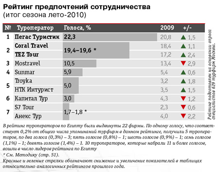 Правда, эксперты отмечают, что Турция вновь оттянула на себя долю турпотоков, которую она год назад уступила Египту, и спрос на него летом-2010 уже не был рекордным (подробнее об этом на стр 44). И все же в верхней части египетской таблицы, составленной по итогам опроса столичных турагенств, мы видим рост показателей у лидеров. «Пегас Туристик» прибавил 1,5% голосов, получив в общей сложности 22% агентских предпочтений. TEZ Tour и Coral Travel тоже оказались в плюсе, набрав, соответственно, 2,4 и 1,1% дополнительных голосов. Такая синхронность на этом направлении не кажется чем-то из ряда вон выходящим. «Игроки-лидеры не изменились. Ряд фирм ослабил свое влияние. А те, кто делает погоду на рынке туров в Египет, шли вровень по ценам и если снижали их, то делали это практически одновременно», – комментируют эксперты.