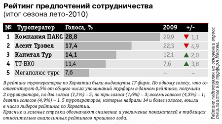 Также как и в турецком рейтинге, наши собеседники отметили ослабление позиций Mostravel: 10,5% голосов против 13,4% год назад (причины называли те же). И снова же – активизацию «НТК Интурист» (+1,5% голосов в сравнении с итогами лета-2009): этот туроператор получил эксклюзив на ряд отелей и теперь пожинает плоды.