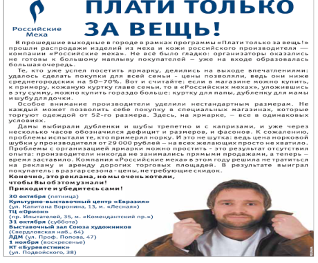 Рубричная реклама. Может быть использована для проведения творческих рекламных кампаний. Поскольку для этого раздела издатели принимают полностью подготовленный к печати оригинал, нет никаких ограничений на дизайн объявления.