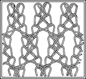 Пике (рис. 17) имеет петельный узор в виде пчелиных сот с одной (одинарное) или с двух сторон (двойное). Вырабатывается на базе интерлока и прессовых петель. Обладает малой растяжимостью, эластичностью и красивым внешним видом. Применяется для тех же целей, что и трикотажный репс. Рисунчатые двойные полотна создаются также путем сдвига одной игольницы относительно другой. Основой для их выработки служат фанг, полуфанг, ластик, интерлок и другие переплетения.