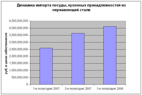 Продукция отечественных производителей занимает ничтожно малую долю рынка посуды и кухонных принадлежностей из нержавеющей стали, и, скорее всего, такое положение дел сохраниться еще долго. Еще более ухудшил ситуацию на рынке посуды из нержавеющей стали кризис 2008 года, который в частности затронул и металлургическую промышленность. В сложившейся ситуации доминировать на рынке, вероятнее всего, будут зарубежные производители. Ассортимент продукции, поступающей от зарубежных производителей очень широк. Значительная часть посуды и кухонных принадлежностей из нержавеющей стали завозится в Россию по заниженным ценам, что способствует увеличению объема продаж. Объем ввезенного товара в 2007 году, составил немногим более 5 млрд. рублей в ценах себестоимости (с учетом НДС, таможенных платежей, транспортных расходов). По итогам первого полугодия 2008 года наблюдался значительный рост объема ввозимой продукции - в 1,6 раза по сравнению с первым полугодием 2007 года (в денежном выражении без учета инфляции).