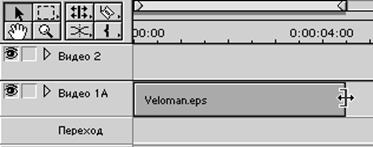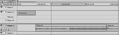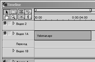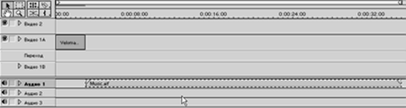 1. Переносимо аналогічним образом звуковий кліп з вікна Project (Проект) на трек Audio 1 (Аудіо 1) у вікні Timeline (Тимчасова шкала) так, щоб його ліва границя вирівнялася із правою границею кліпу Veloman.eps на треку Video 1A (Відео 1А).