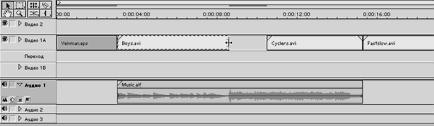 1. Послідовно перенесемо кліпи Boys.avi, Cyclers.avi і Fastslow.avi на трек Video 1A (Відео 1А). розташувавши їх після кліпу Veloman.eps.