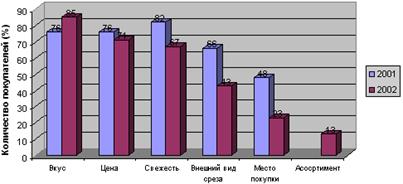 Поэтому, как для новых производителей, так и для тех, которые прочно закрепились на рынке, но хотят увеличить количество своих приверженцев, важным вопросом остается вопрос о приоритетах конечных потребителей продукции. Вызвало ли изменение лидера рынка изменение приоритетов покупателей? Или наоборот, смена лидера есть показатель смены приоритетов? Исследования октября 2002 года показали, что за год произошли изменения тех характеристик, которые влияют на принятие решения покупателем о приобретении продукции того или иного производителя (Рис.4).