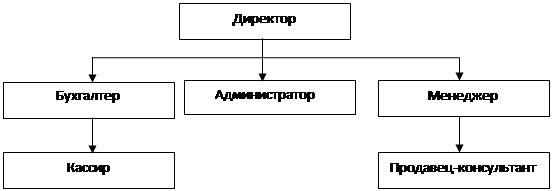 Организационная структура ИП Колпакова Т.И. является довольно простой в связи с малыми её размерами и относительно небольшим количеством сотрудников. В организации работают 12 человек, а именно директор, бухгалтер, 2 администратора, менеджер, 3 кассира и 7 продавцов-консультантов.