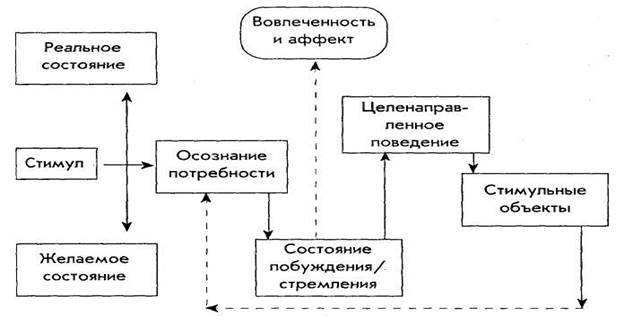 Мотивация (motivation) связана с концепцией движения (motion). Мотив — это невидимая, неявная внутренняя сила, стимулирующая и вынуждающая поведенческую реакцию и обеспечивающая специфическое направление для этой реакции. Мотив невидим, вывод о существовании мотивов можно сделать, например, исходя из поведения индивидуумов. На рис. 1 показана модель процесса мотивации, основными элементами которой являются: активация потребности, состояние побуждения, целенаправленное поведение, стимульные объекты и аффект.