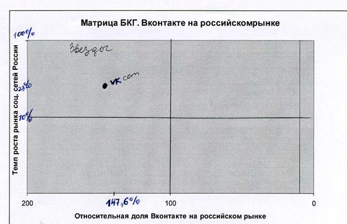 По матрице БКГ на российском рынке компания лидирует и оказывается в ячейке «Звезды»: темпы роста российского рынка социальных сетей крайне высока – 23% в год[8] – эту «крайность» обеспечивает количество пользователей-клонов и просто страниц несуществующих людей, но и без них темпы роста российского рынка социальных сетей имеют самый высокий показатель в мире по данным lenta.ru, а сайт социальной сети Вконтакте на этом рынке занимает самую высокую высокую долю – более 50%[9] (31% населения посещает этот сайт ежедневно, в то время как второй по популярности сайт «Одноклассники» посещают 21% ежедневно).[10] Относительная доля Вконтакте, по сравнению с Одноклассниками, составляет 147,6 %. В то время, как ее относительная доля в Японии, практически равна 0.