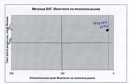 К сожалению, если рассматривать ситуацию с японским рынком, будущее не кажется столь безоблачным. Доля компании на японском рынке на данный момент практически нулевая, в то время как доля главного конкурента Mixi – около 80% всего рынка, что создает неблагоприятную картину для Вконтакте, чья относительная доля на японском рынке практически равняется 0. Темпы роста спроса на рынке социальных сетей высоки[11] , по количественным показателям они не меньше, чем в России с учетом того, что по развитию информационных технологий Япония одна из самых передовых стран, с каждым днем все больше пользователей участвуют в виртуальной жизни человечества, и компания становится «трудным ребенком», которого необходимо вырастить и воспитать. «Трудному ребенку» полагается инвестирование и избирательное развитие для того, чтобы улучшить свои позиции на рынке. Судя по тому, что я описала выше о компании и ее проблемах, - позиция по матрице БКГ определена правильно и соответствует действительности.