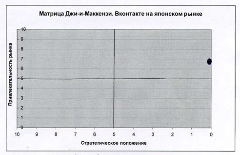 По матрице Джи-И-Маккензи девизом компании «Вконтакте» на японском рынке должен стать «Удержать и усилить позиции», так как несмотря на высокую привлекательность рынка (а рынок привлекателен, так как имеет огромную аудиторию, которая постоянно растет), стратегическое положение компании пока не очень сильно, по десятибалльной шкале его, на данный момент, можно оценить ближе к отметке 0.
