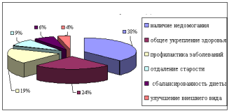 Важнейшим мотивом приобретения спортивных добавок является наличие недомогания, связанного со слабой спортивной подготовкой, менее значимыми мотивами являются общее укрепление здоровья и профилактика заболеваний (мотив - болеть слишком дорого), отдаление старости, улучшение внешнего вида и достижение сбалансированности и полноценности диеты (см. диаграмму 2).