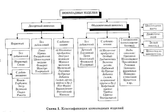 В зависимости от применяемого сырья и технологии производства кондитерские товары делят на две основные группы: сахаристые и мучные. В группу сахаристых кондитерских изделий входят карамель, фруктово-ягодные изделия, конфеты, драже, ирис, шоколад и шоколадные изделия, халва, восточные сладости. Группа мучных кондитерских изделий включает печенье, пряники, крекер, вафли, торты, пирожные, рулеты, кексы и т.д. Продукция данной товарной группы насчитывает свыше 2 тыс. наименований изделий и ее ассортимент постоянно расширяется.