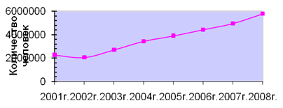 Рассматривая данный Рисунок, нельзя не обратить внимание на стремительный рост общего числа туристов за каждый год, который в среднем увеличивается на 363021 человек. В феврале 2002 года в северной Индии была зафиксирована вспышка легочной чумы (которая последний раз была в 1983 г.), вследствие этого прослеживается спад туристов из-за рубежа в Индию в среднем на 210 тысяч человек. Но уже к 2008 г. несмотря на кризис и шаткое экономическое положение стран во всем мире, количество прибывших туристов в Индию составило около 5,8 млн. человек [12].
