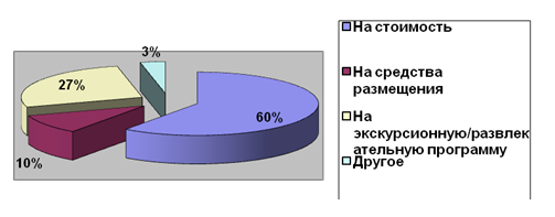 При выборе тура респонденты в первую очередь обращают внимание на стоимость путешествия (60%), что, безусловно, связанно с экономическим положением страны и достаточно высоким уровнем безработицы в связи с мировым экономическим кризисом. Всего 10% опрошенных, при выборе тура обращают внимание на средства размещения. И один человек отметил, что совершая путешествия он обращает внимание на стоимость и на популярность страны (место посещения).