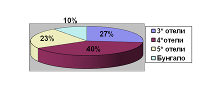 Что касается типа размещения, то большинство потенциальных туристов предпочитают 4* отели, однако это один из самых дорогих видов размещения, что, безусловно, отразится на общей стоимости тура. Осознавая это, 27% респондентов, совершая туристскую поездку в Индию, выбрали бы размещение в отелях 3*. Так же хотелось бы отметить, что 10% опрашиваемых, хотели бы остановиться в бунгало. Это не самый комфортабельный, но более экзотический вид размещения. В Индии такой тип размещения достаточно популярен, особенно на пляжах Гоа, где предлагают размещение в двух- трехместных бунгало. В каждом бунгало спальня, ванная комната, балконы с видом на океан, а также в комплекс обычно входят рестораны. Поэтому размещение в подобном бунгало не принесет потенциальным туристам неудобств (Рис.8).