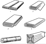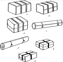 Подготовленные таким образом текстильные материалы и штучные изделия помещают в фанерные или деревянные ящики (жесткая внешняя упаковка ), или обертывают бумагой и зашивают в паковочную хлопчатобумажную или синтетическую ткань (мягкая внешняя упаковка ), или капу, со всех сторон покрывают оберточной и паковочной тканью, прессуют, кладут деревянные планки и обвязывают железной проволокой или лентой (полужесткая внешняя упаковка ). К мягкой таре относят кипы, тюки, мешки, рулоны (Рис.6).